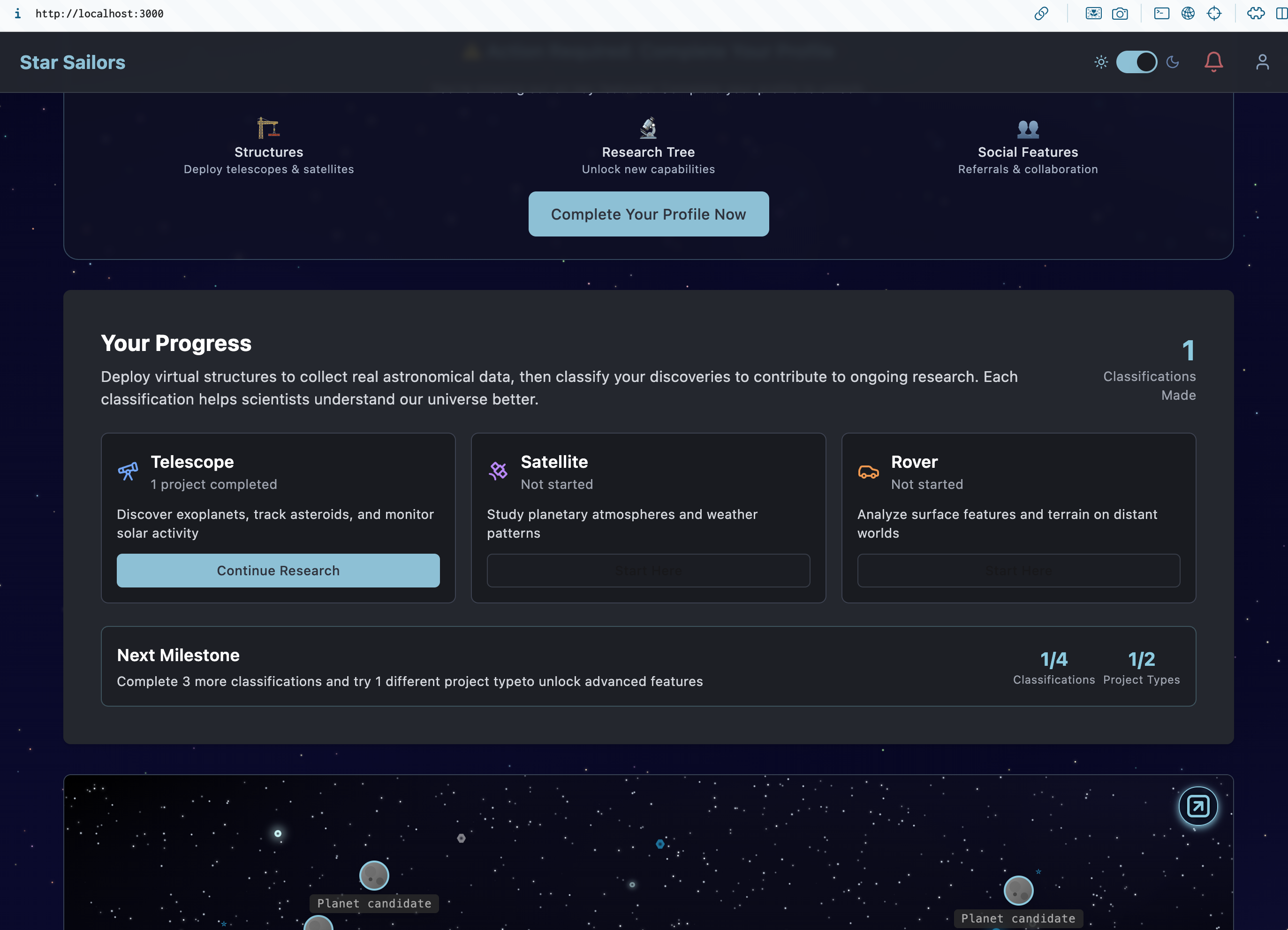I think, instead, I’ll add a little “Your Progress” card that can show the user the basics and their progress towards “getting started”. For example, we’ll show users the structures/tools they’ve interacted with, and their skills. Plus buttons to “improve their skills” (i.e. make more classifications).